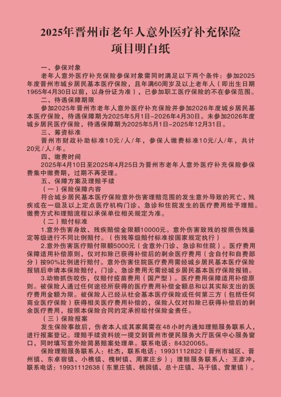 2025年晋州市老年人意外医疗补充保险缴费开始了