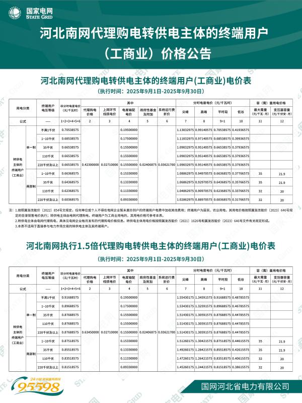 河北南网代理购电转供电主体的终端用户(工商业)价格公告(2025年9月)