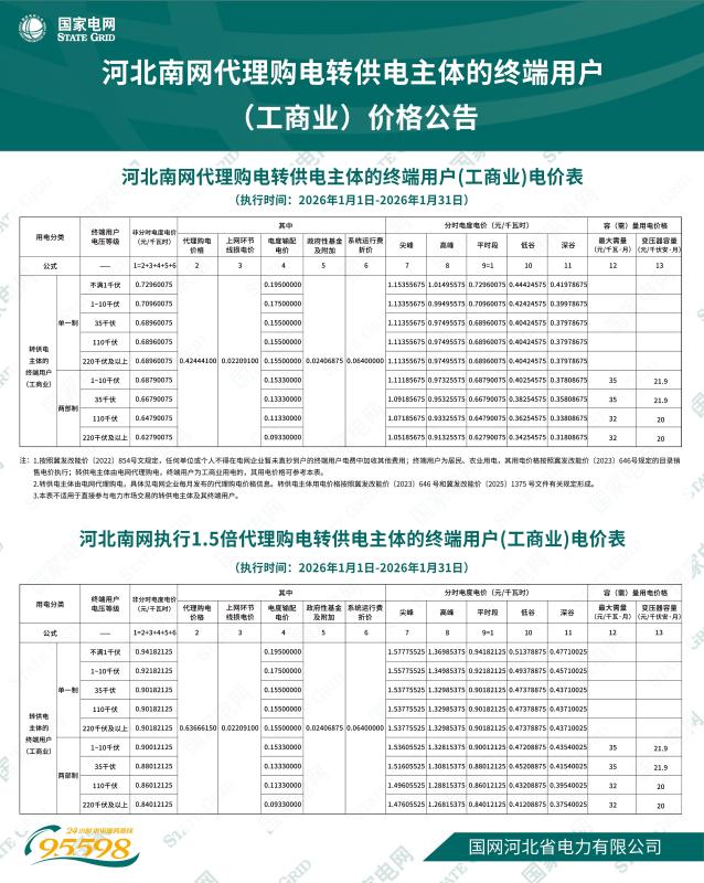 河北南网代理购电转供电主体的终端用户(工商业)价格公告(2026年1月)
