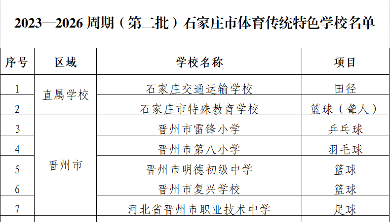 二、经各县(市、区)体育、教育行政部门和市直属学校推荐,石家庄市体育局、教育局审核评定,决定命名101所学校为2023—2026周期石家庄市体育传统特色学校,其中我市5所学校成功入选。