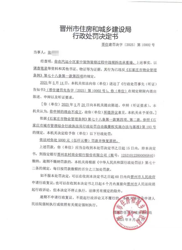 张某在汽运小区家中装饰装修过程中违规拆改承重墙案 晋住建罚决字[2025]第10002号