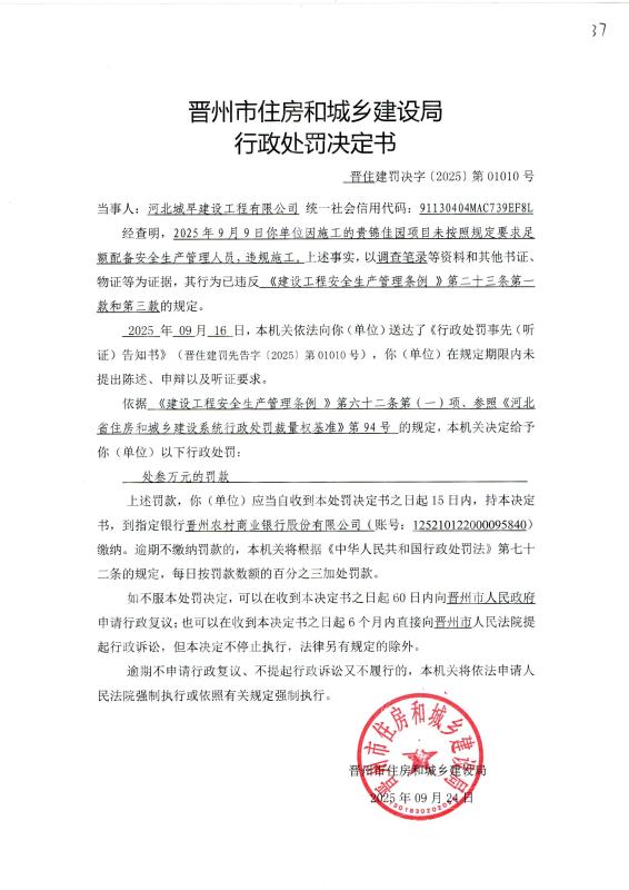 河北城早建设工程有限公司违反相关安全治理规定案 晋住建罚决字[2025]第01010号