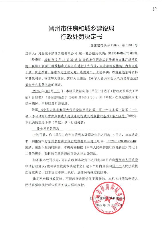 河北城早建设工程有限公司违反相关扬尘治理规定案 晋住建罚决字[2025]第01011号