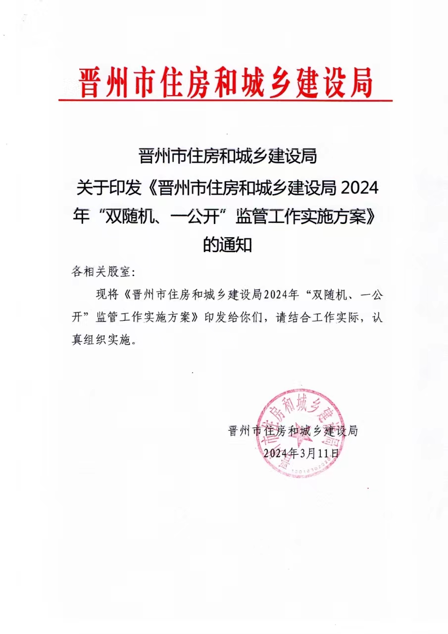 晋州市住房和城乡建设局关于印发《晋州市住房和城乡建设局2024年“双随机、一公开”监管工作实施方案》的通知