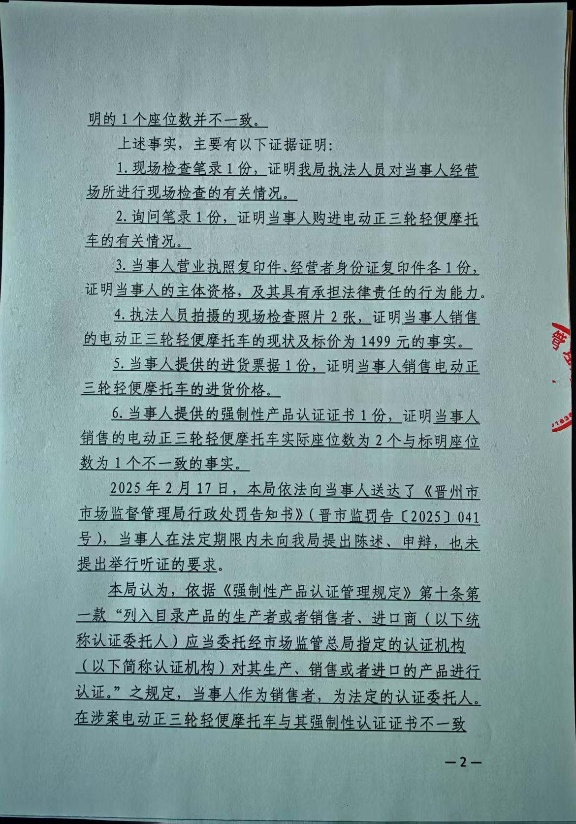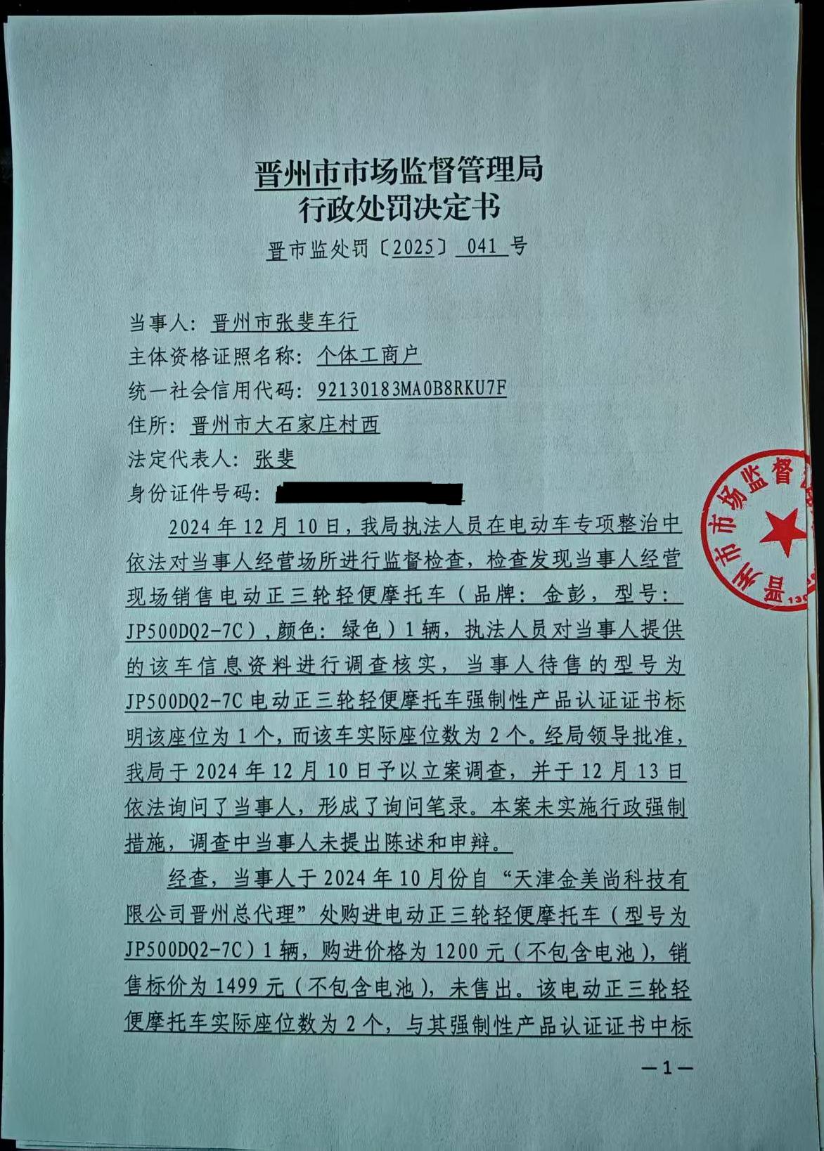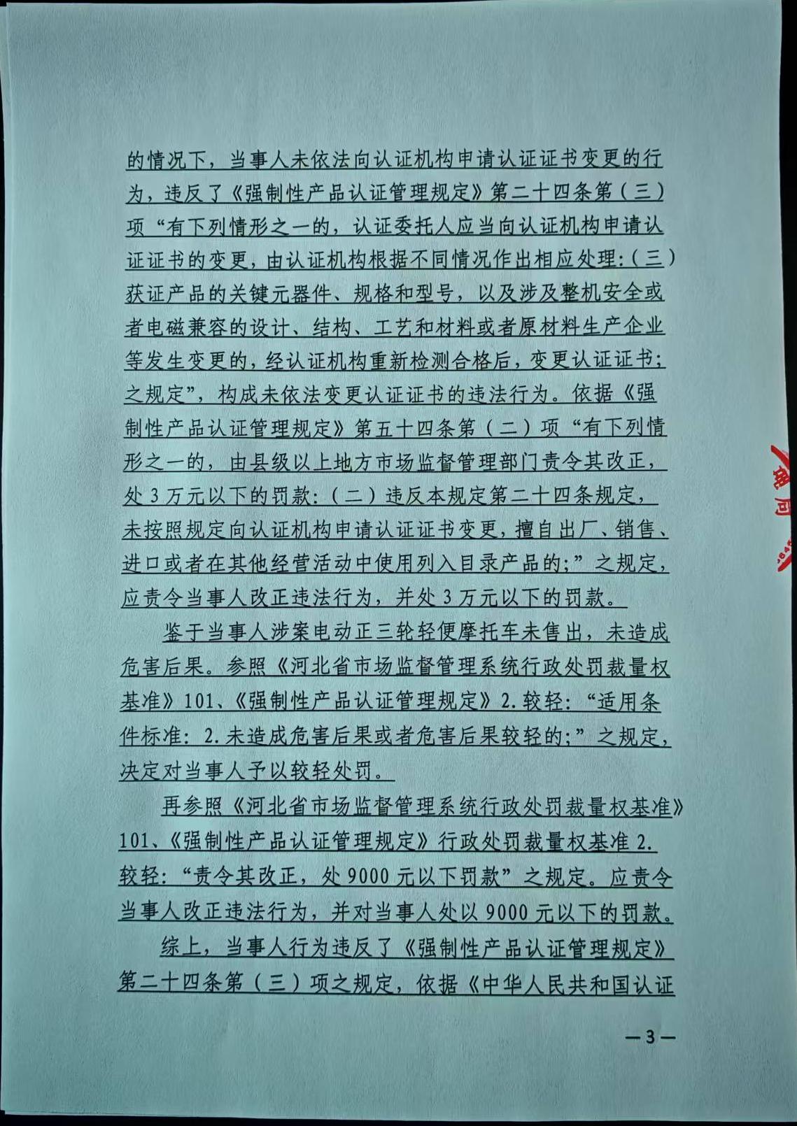 晋州市张斐车行销售未依法变更强制性认证证书的电动正三轮轻便摩托车案