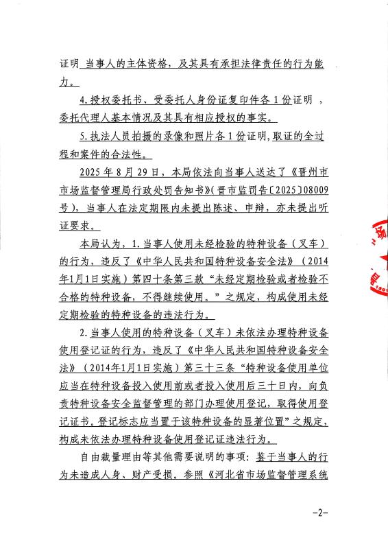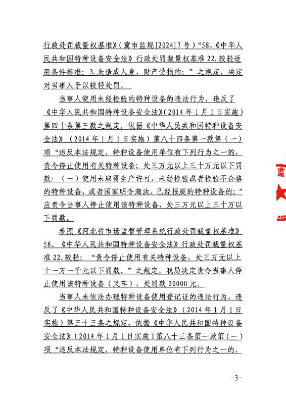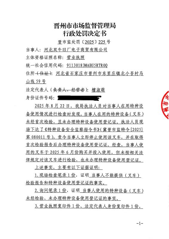 河北双牛旧厂电子商贸有限公司使用未经检验及未依法办理特种设备使用登记证的叉车案