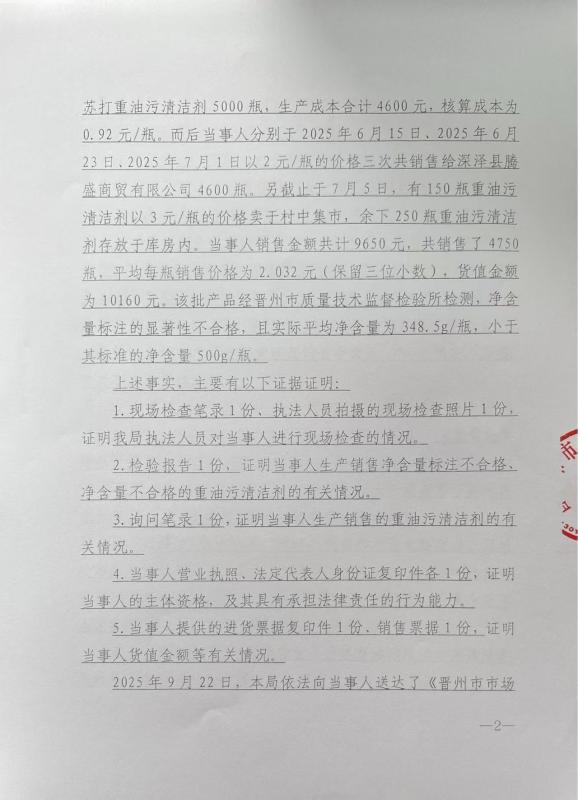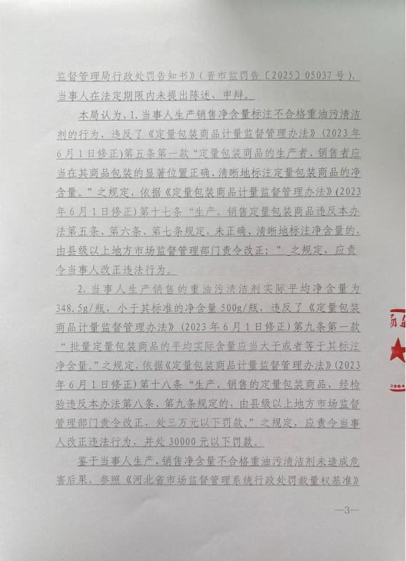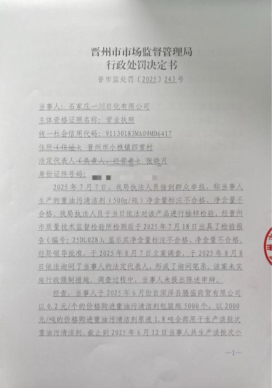 石家庄一川日化有限公司生产销售净含量标注不合格、净含量不合格的重油污清洁剂案