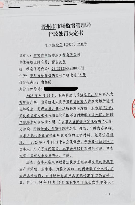 石家庄鼎新防水工程有限公司未依法变更市场主体登记事项、发布虚假广告案
