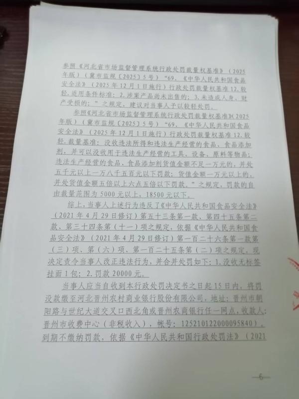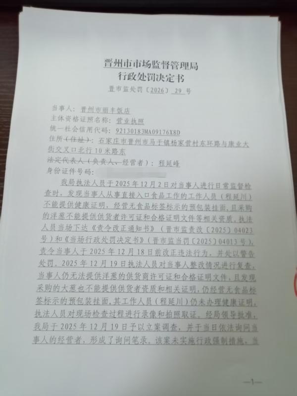 晋州市丽丰饭店采购食品未查验供货者相关资质和其他合格证明、食品经营人员未取得健康证明从事直接入口食品工作以及经营无标签的预包装食品案
