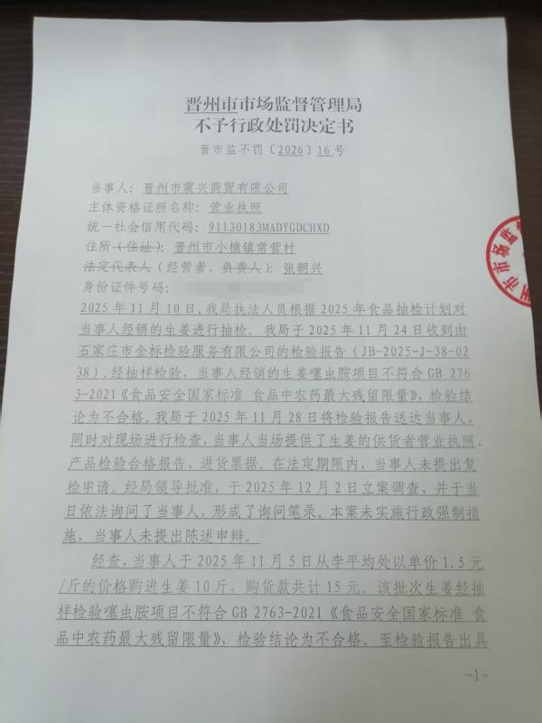晋州市震兴商贸有限公司经营农药残留超过食品安全标准限量的食品案