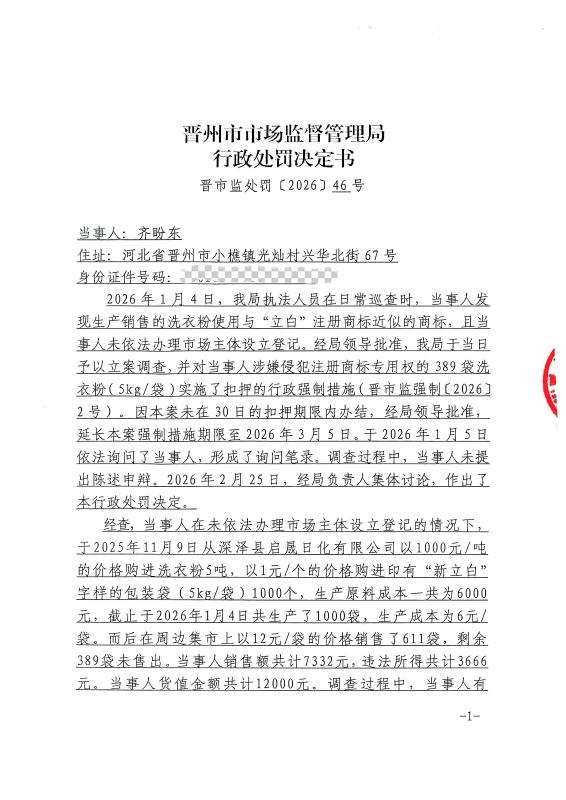 齐盼东未经依法办理市场主体设立登记生产销售侵犯“立白”注册商标专用权洗衣粉