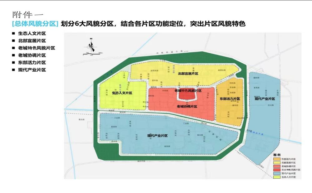 第四条中心城区分为六大风貌片区,分别为老城特色风貌片区、老城协调风貌片区、西部生态人文片区、北部现代宜居片区、东部绿色活力片区和现代产城融合片区。
