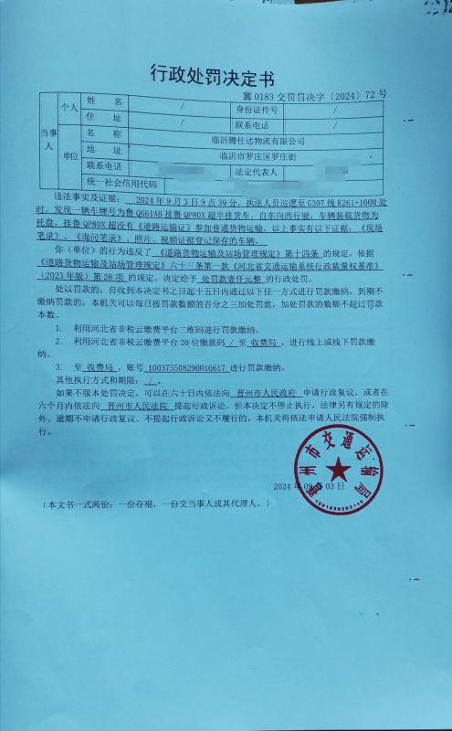 临沂腾仕达物流有限公司使用无《道路运输证》的车辆鲁QP80X超货车参加普通货物运输案 冀0183交罚【2024】72号