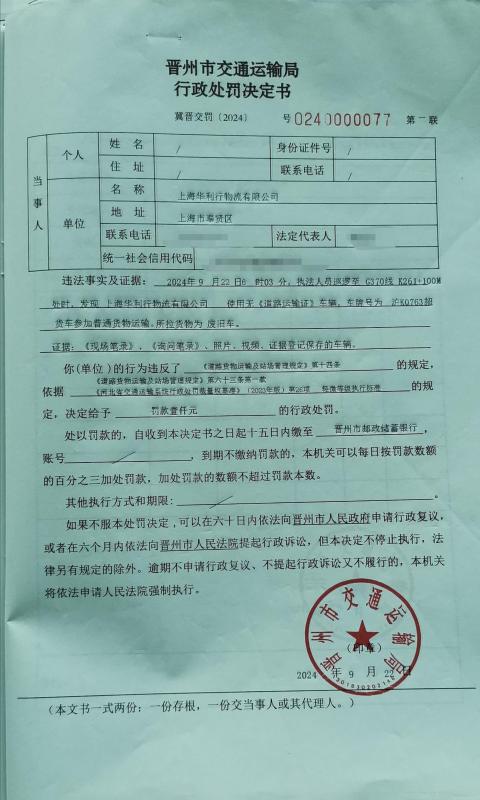 上海华利行物流有限公司使用无《道路运输证》的车辆沪K0763超货车参加普通货物运输案 冀晋交罚【2024】0240000077号