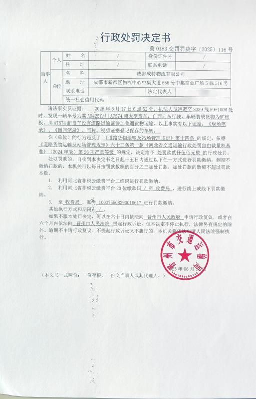 成都成特物流有限公司使用无《道路运输证》的车辆川A7574超货车参加普通货物运输案 冀0183交罚决字〔2025〕116号