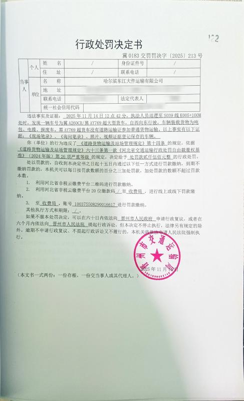 哈尔滨东江大件运输有限公司使用无《道路运输证》的车辆黑AY769超参加普通货物运输冀0183交罚罚决字〔2025〕213号