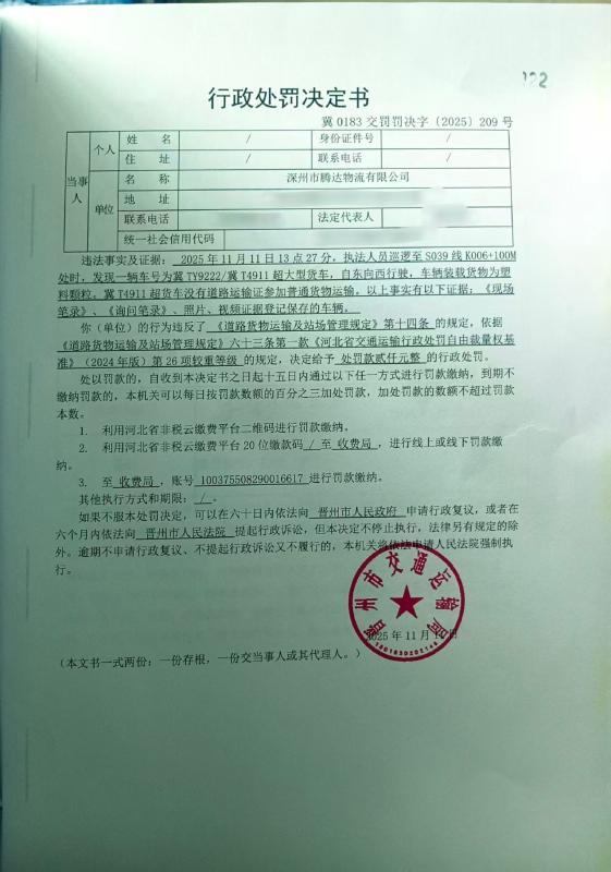 深州市腾达物流有限公司使用无《道路运输证》的车辆冀T4911超参加普通货物运输冀0183交罚罚决字〔2025〕209号