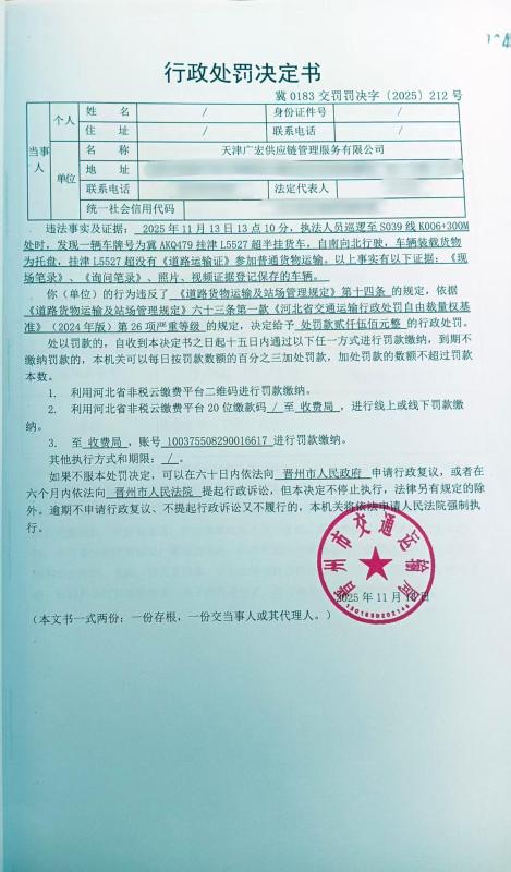 天津广宏供应链管理服务有限公司使用无《道路运输证》的车辆津L5527超参加普通货物运输冀0183交罚罚决字〔2025〕212号
