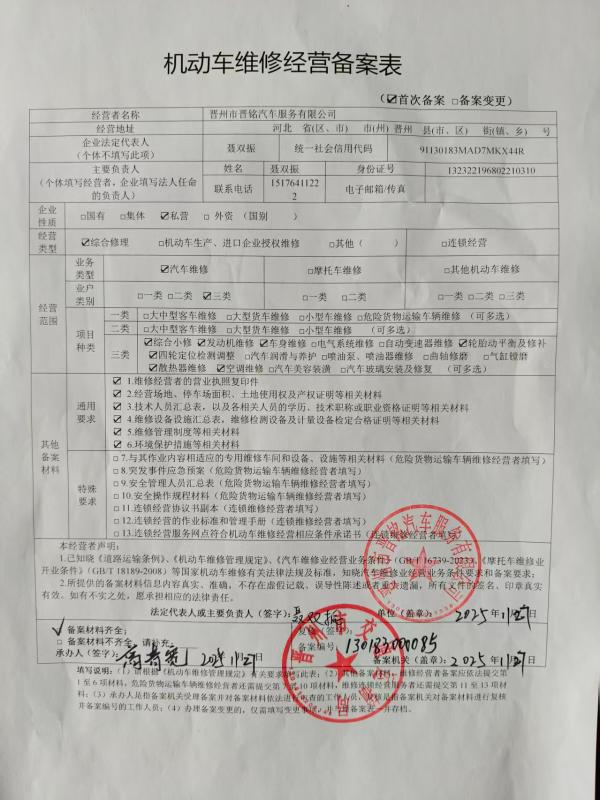 晋州市晋铭汽车服务有限公司机动车维修经营备案表
