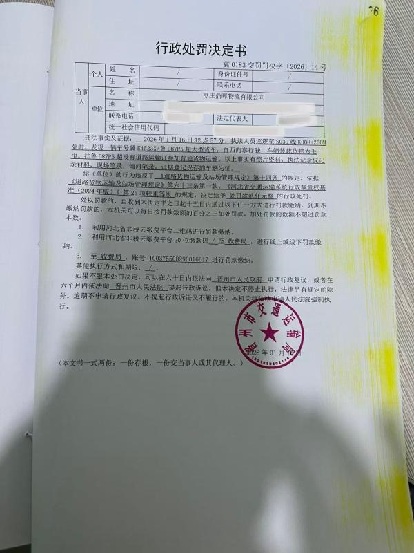 枣庄鼎晖物流有限公司使用无《道路运输证》的车辆鲁D87P5超参加普通货物运输冀0183交罚罚决字〔2026〕14号