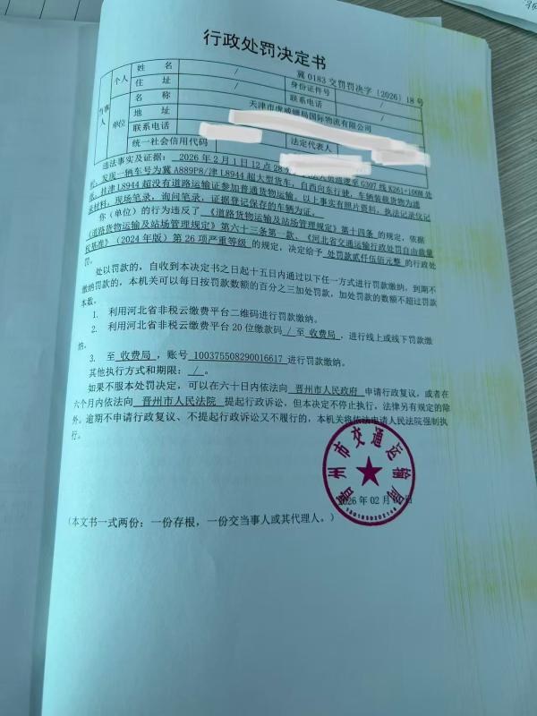 天津市虎威镖局国际物流有限公司使用无《道路运输证》的车辆津L8944超参加普通货物运输冀0183交罚罚决字〔2026〕18号