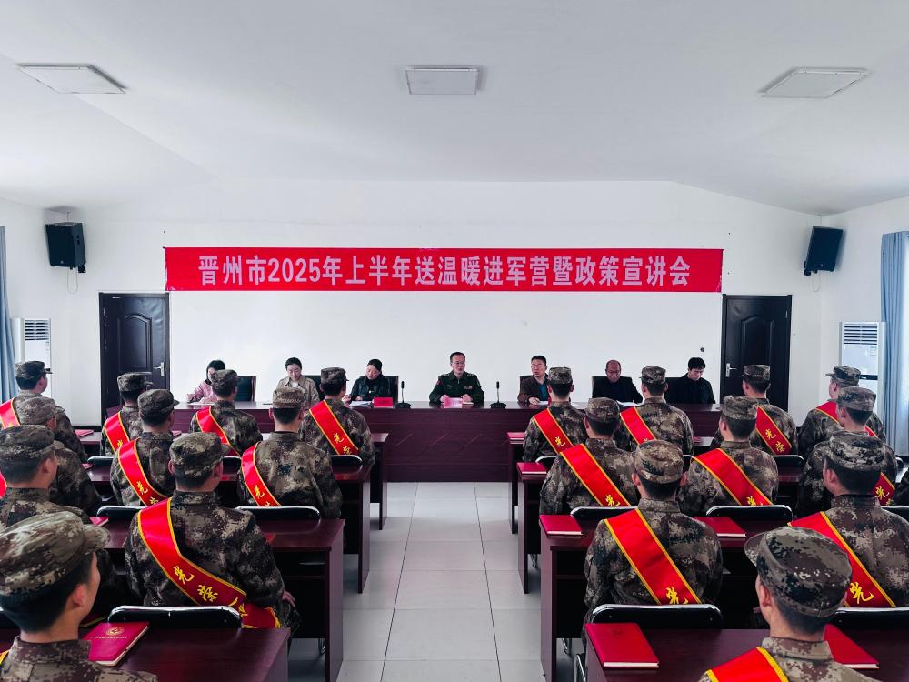 为赓续拥军优属传统,厚植军民鱼水情谊,让即将入伍的新兵更好地了解相关政策,全身心地投身国防事业,3月13日上午,晋州市在民兵训练基地为即将入伍的预征新兵开展政策宣讲暨入伍欢送会。晋州市人武部副部长陈学锋,市退役军人事务局党组成员、一级主任科员韩晓辉,市爱国拥军志愿者联合会、市退役军人事务局相关业务股室工作人员参加活动。