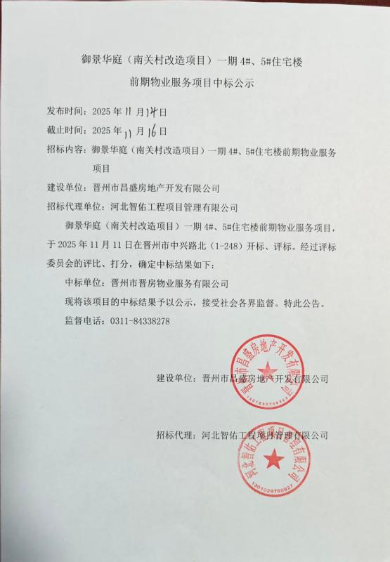 御景华庭(南关村改造项目)一期4#、5#住宅楼前期物业服务项目中标公示