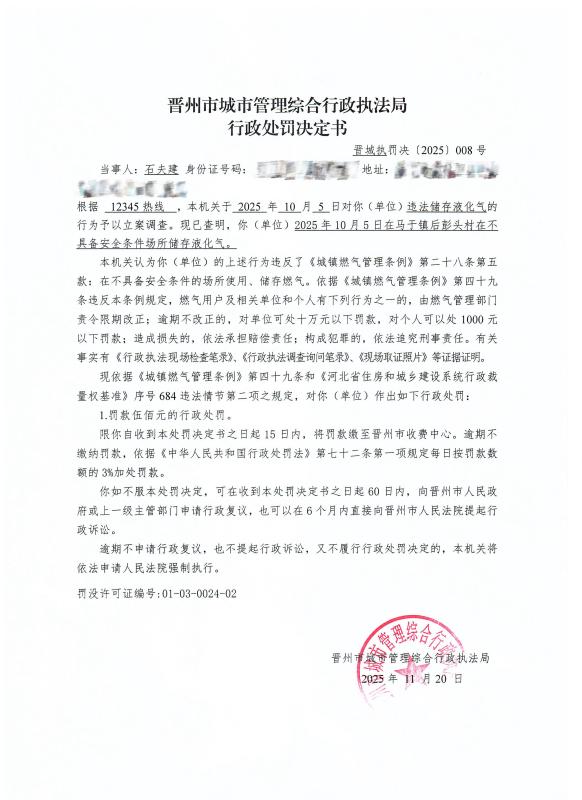 晋州市城市管理综合行政执法局行政处罚决定书【2025】008号